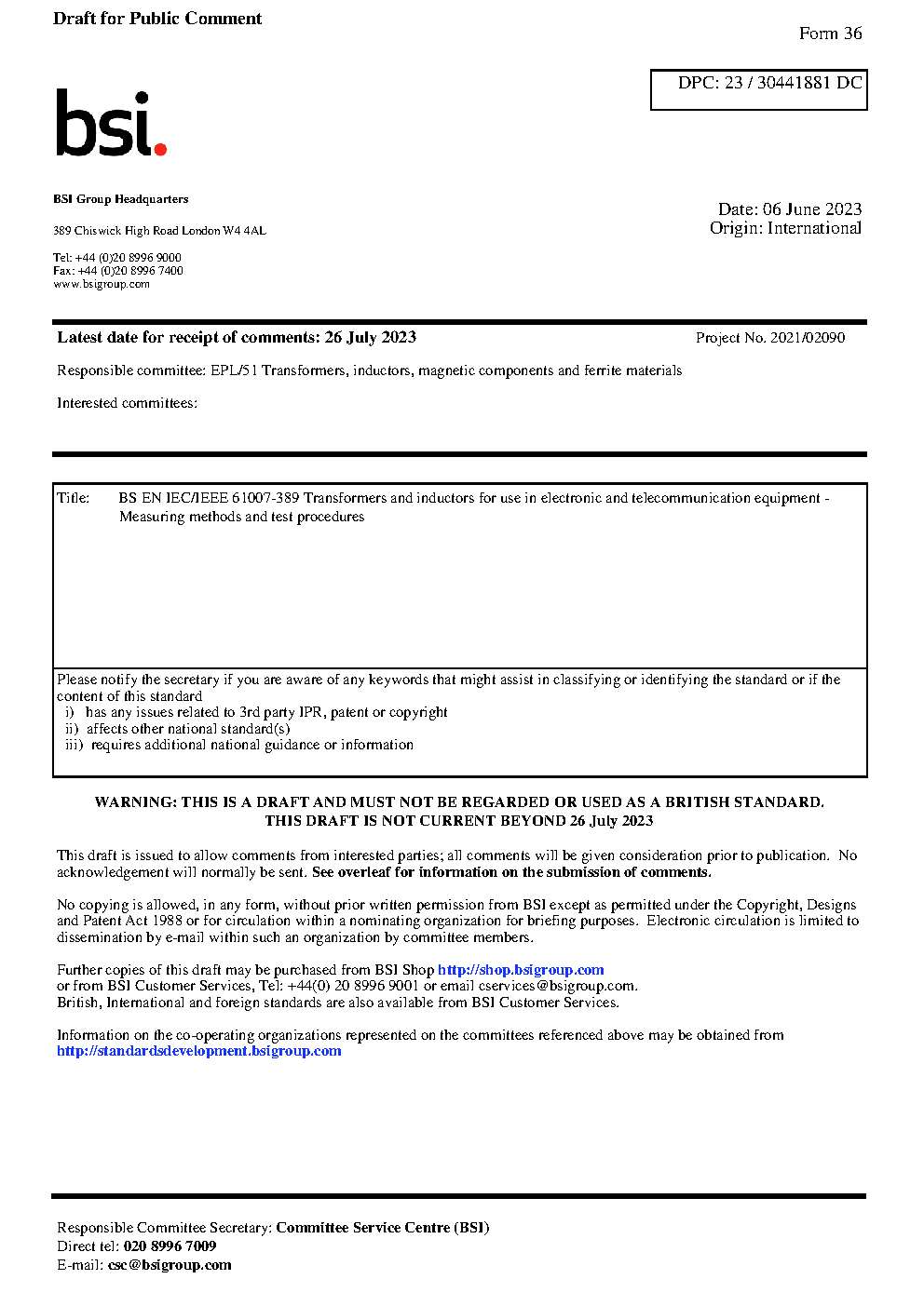 BS EN IEC/IEEE 61007-389. Transformers and inductors for use in electronic and telecommunication equipment. Measuring methods and test procedures