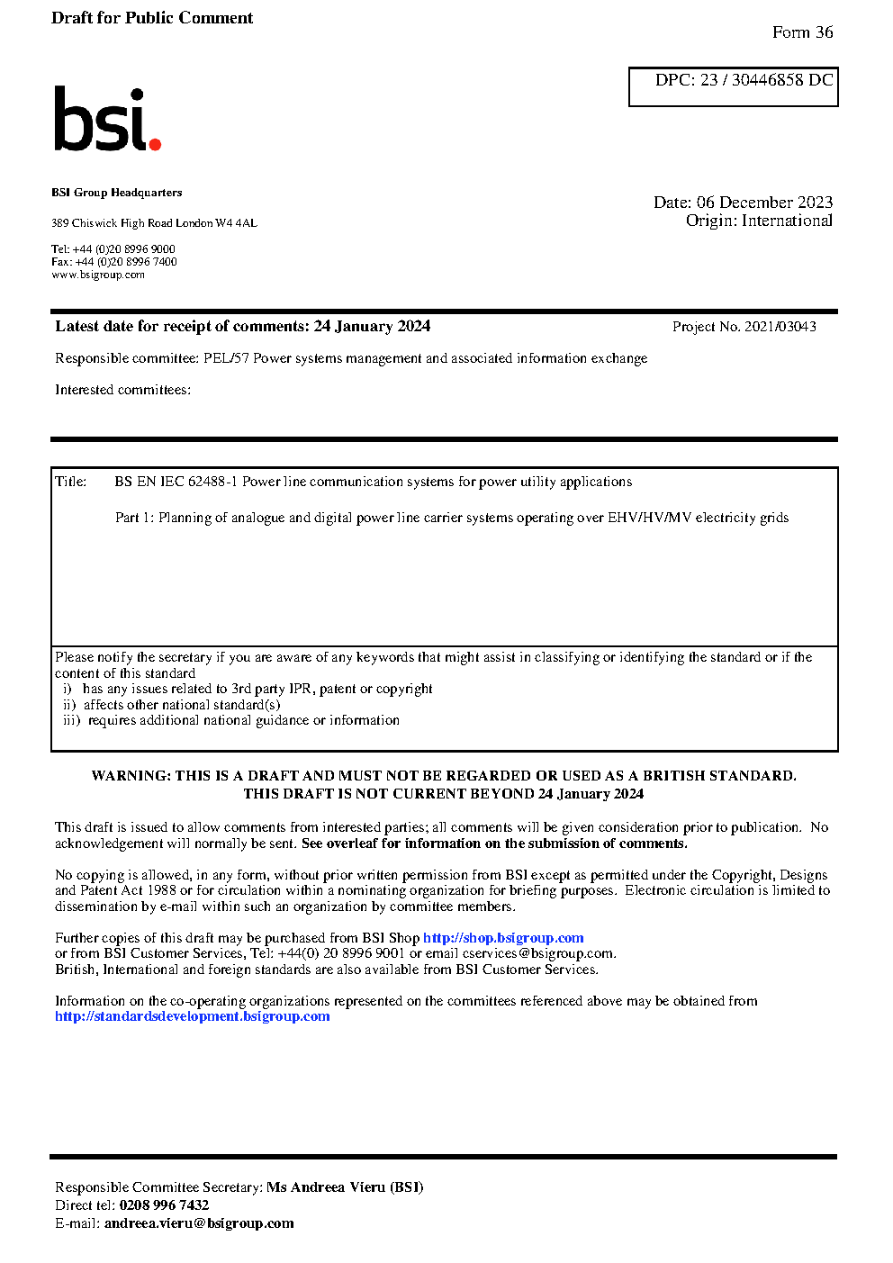 BS EN IEC 62488-1 Power line communication systems for power utility applications Part 1: Planning of analogue and digital carrier operating over EHV/HV/MV electricity grids