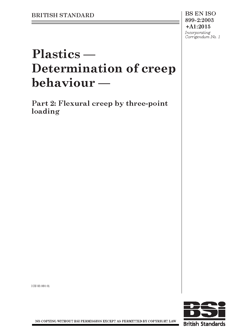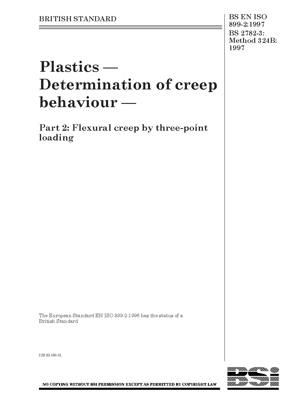 BS EN ISO 899-2. Plastics. Determination of creep behaviour Part 2. Flexural by three-point loading