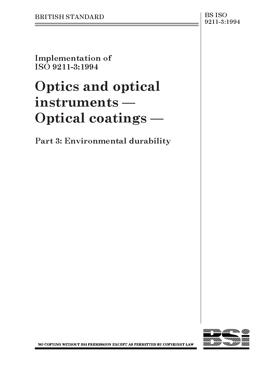 BS ISO 9211-3. Optics and photonics. Optical coatings Part 3. Environmental durability