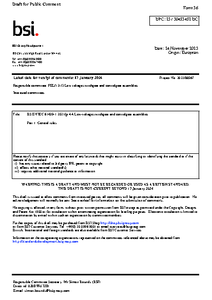 BS EN IEC 61439-1:2021/prAA Low-voltage switchgear and controlgear assemblies Part 1. General rules