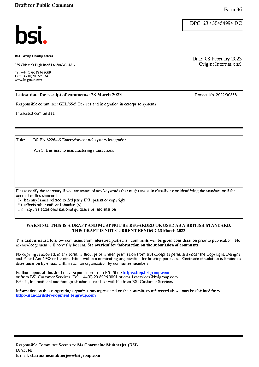 BS EN IEC 62264-5. Enterprise-control system integration Part 5. Business to manufacturing transactions