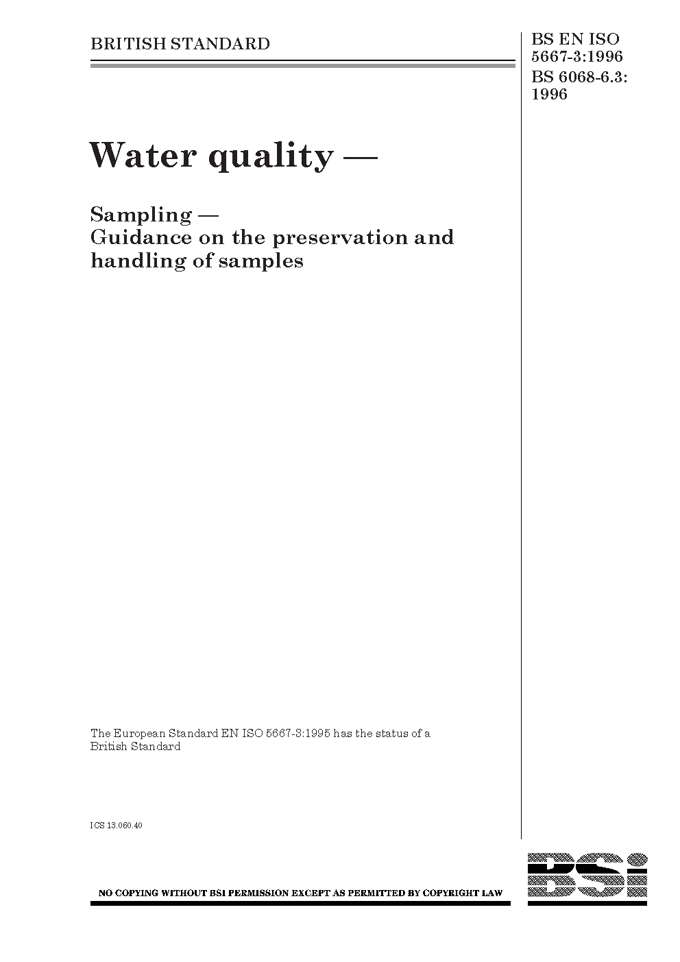 BS EN ISO 5667-3. Water quality. Sampling Part 3. Preservation and handling of water samples