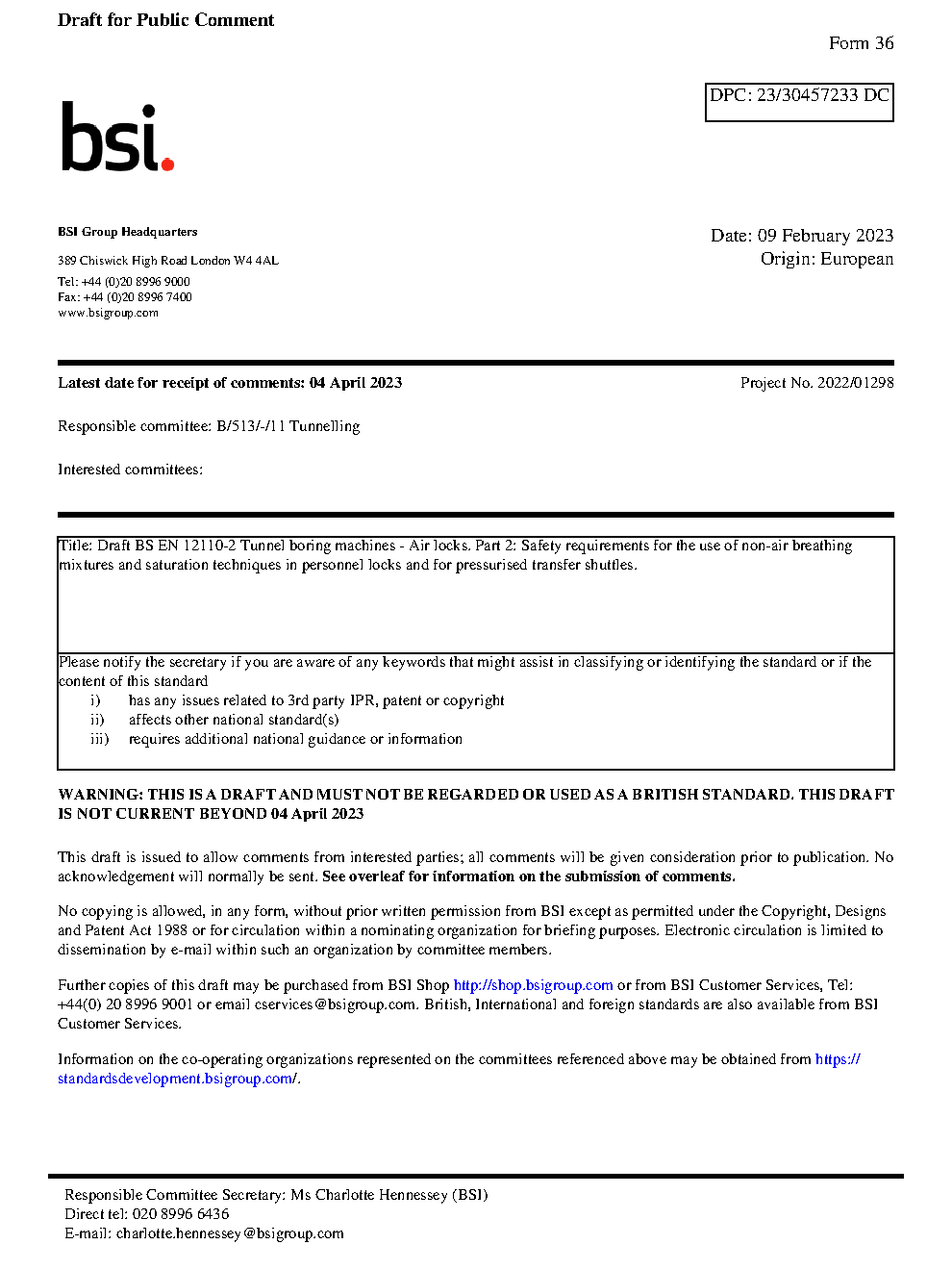 BS EN 12110-2 Tunnel boring machines. Air locks Safety requirements for the use of non-air breathing mixtures and saturation techniques in personnel pressurised transfer shuttles