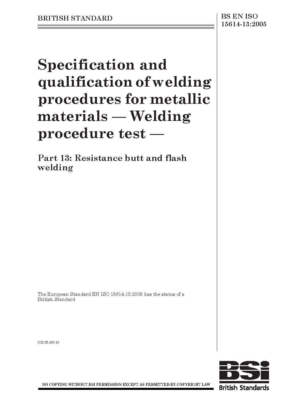 BS EN ISO 15614-13. Specification and qualification of welding procedures for metallic materials. Welding procedure test Part 13. Upset (resistance butt) flash