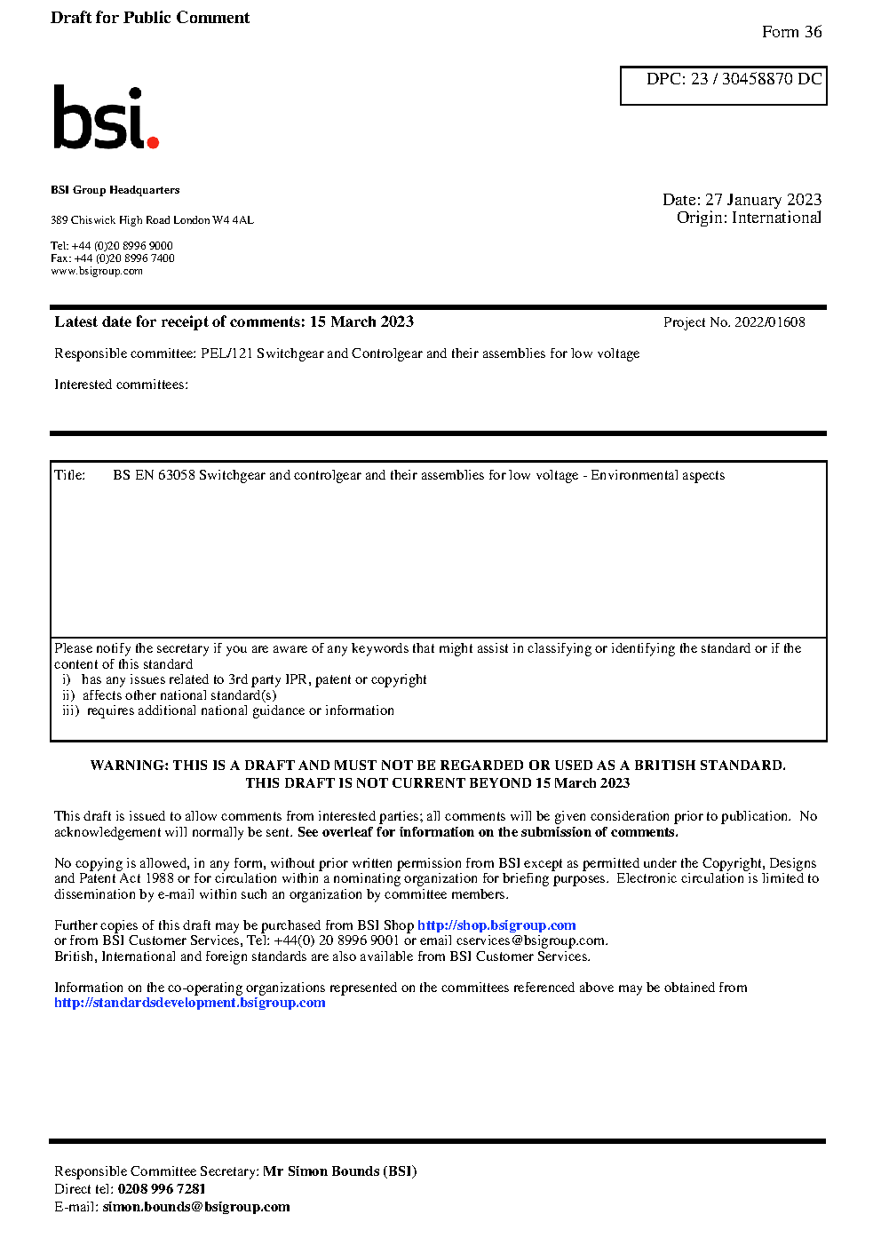 BS EN IEC 63058. Switchgear and controlgear and their assemblies for low voltage. Environmental aspects