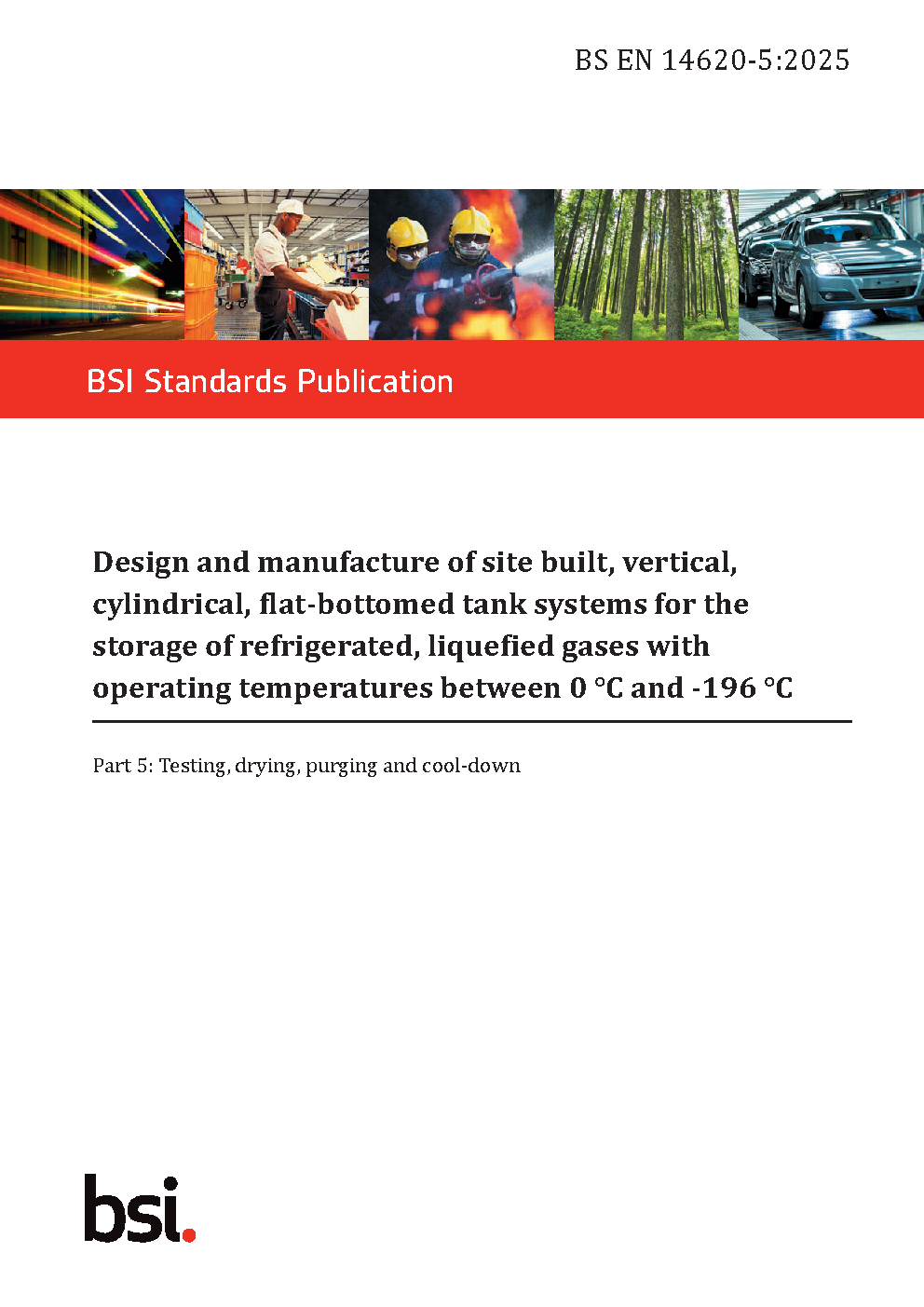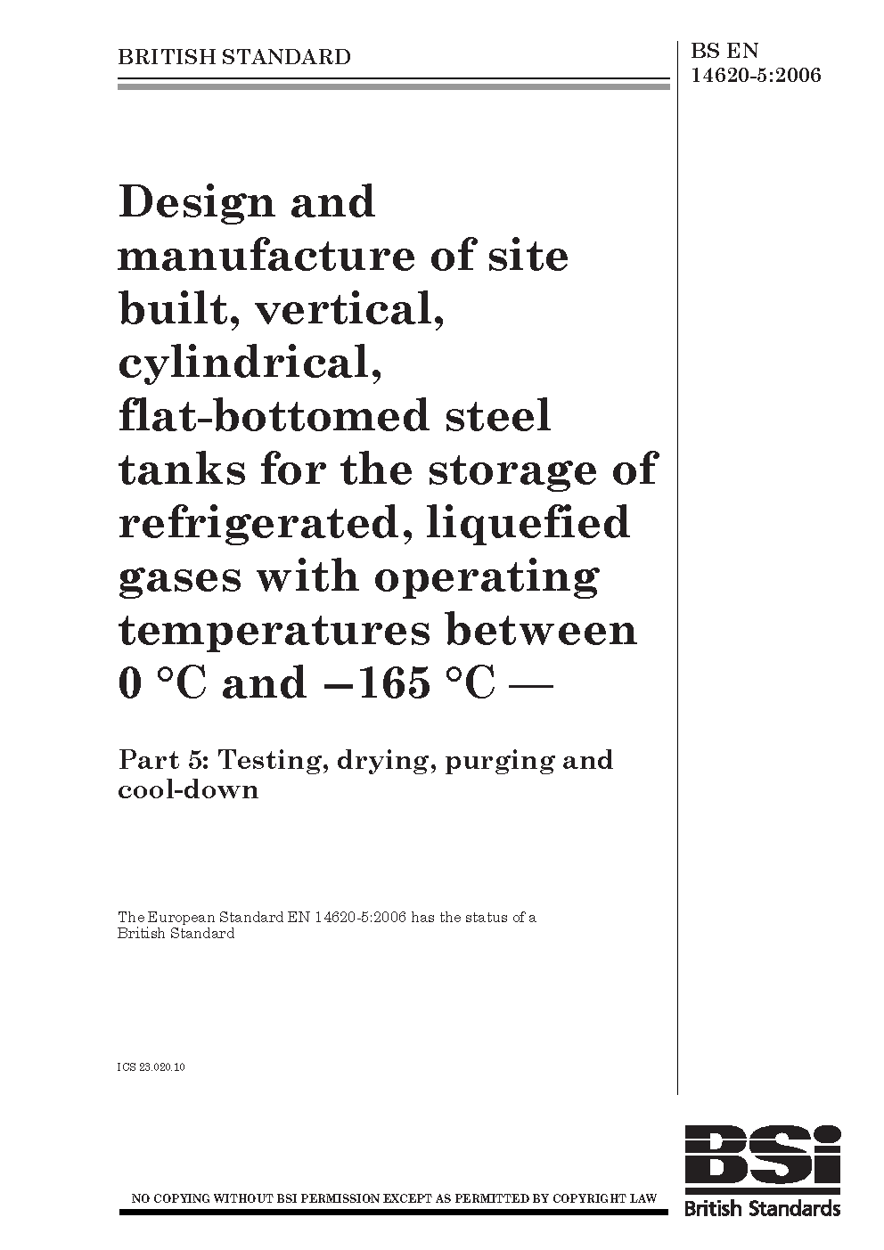 BS EN 14620-5. Design and manufacture of site built, vertical, cylindrical, flat-bottomed tank systems for the storage refrigerated, liquefied gases with operating temperatures between 0 °C -196 Part 5. Testing, drying, purging cool-down