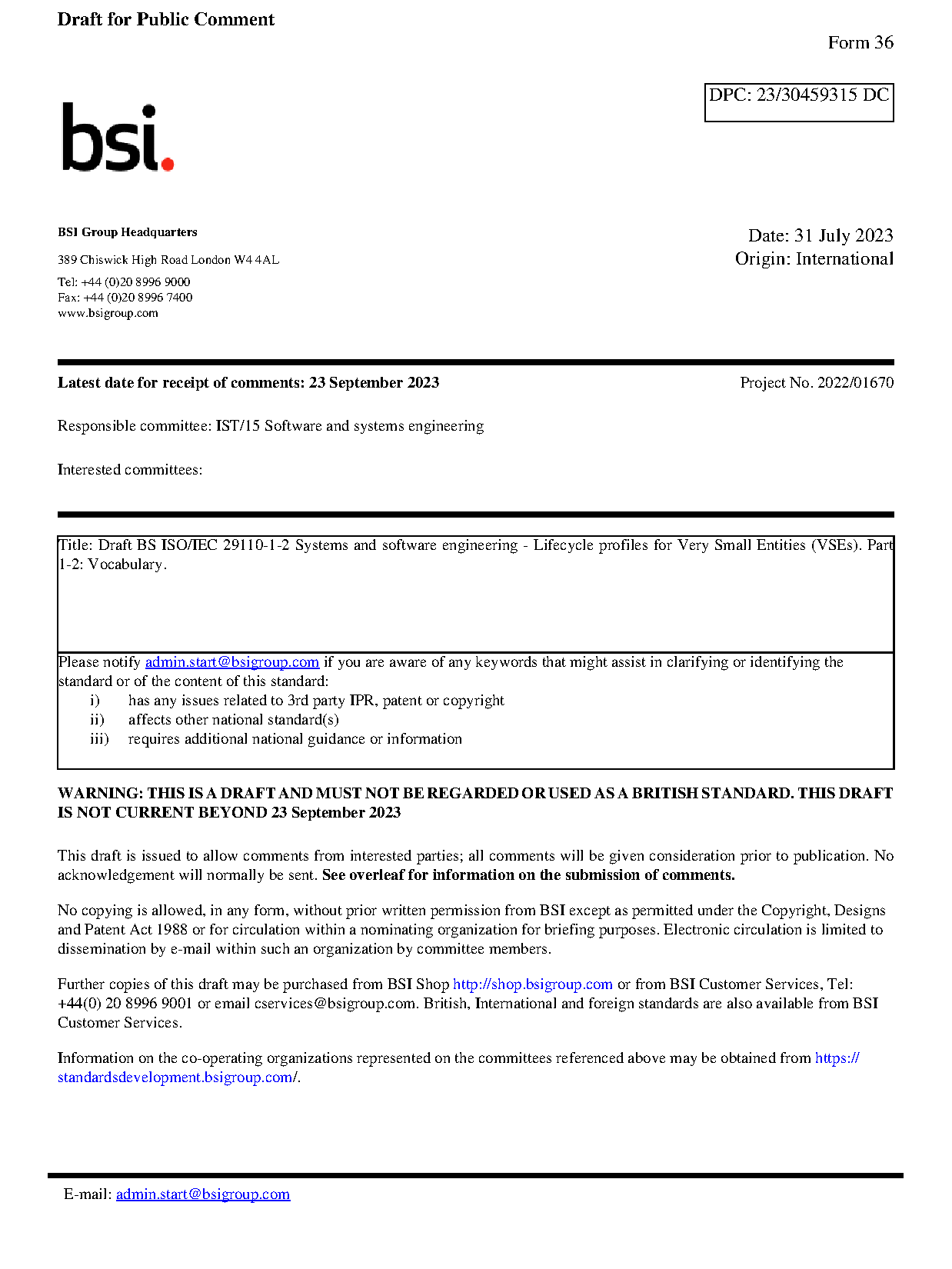 BS ISO/IEC 29110-1-2. Systems and software engineering. Lifecycle profiles for Very Small Entities (VSEs) Part 1-2. Vocabulary