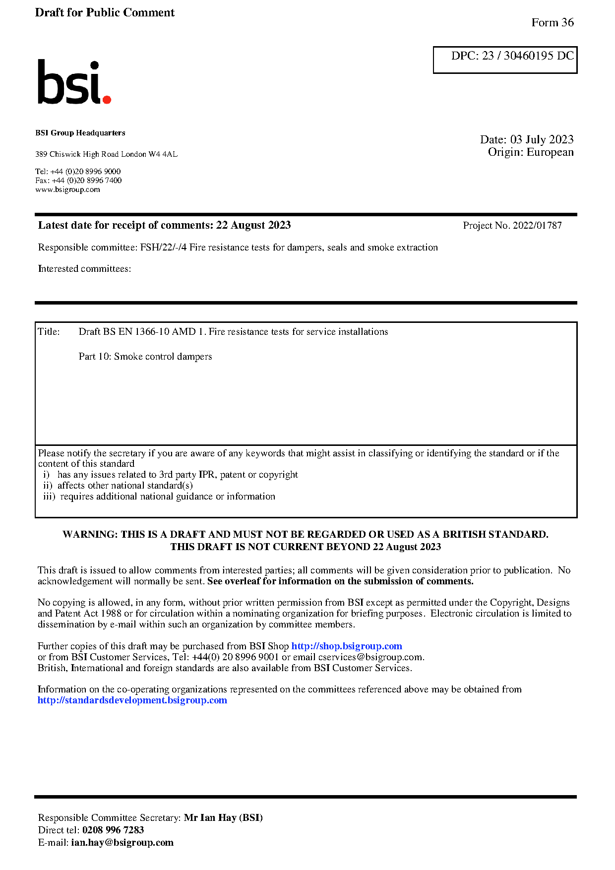 BS EN 1366-10 AMD 1. Fire resistance tests for service installations Part 10. Smoke control dampers