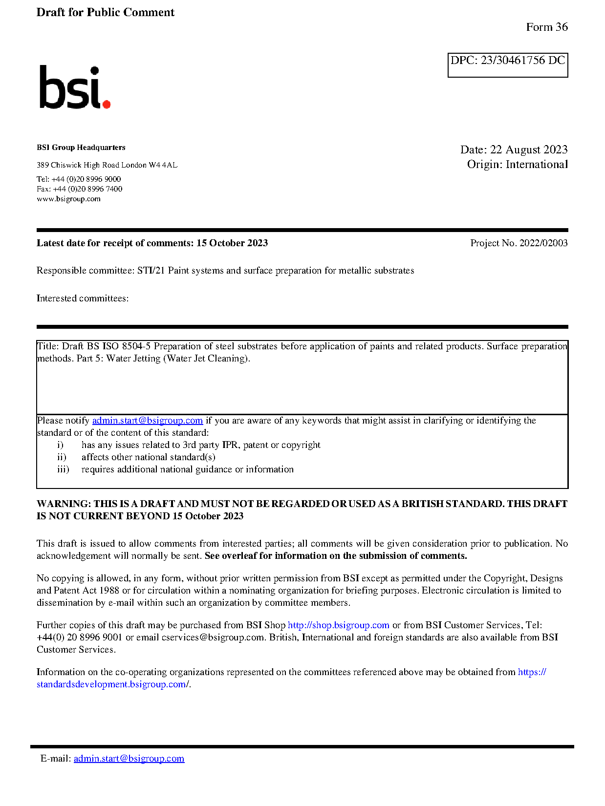 BS ISO 8504-5. Preparation of steel substrates before application paints and related products. Surface preparation methods Part 5. Water Jetting (Water Jet Cleaning)
