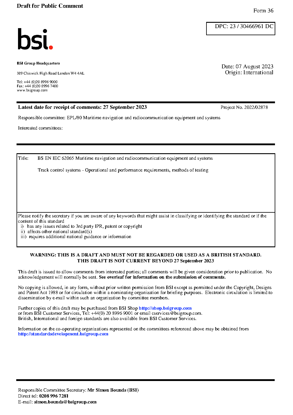 BS EN IEC 62065. Maritime navigation and radiocommunication equipment systems Track control systems. Operational performance requirements, methods of testing