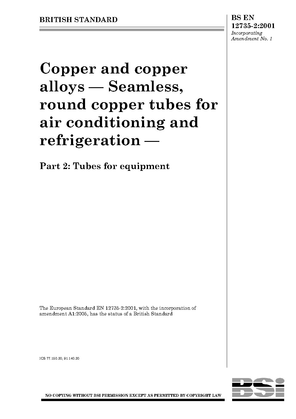 BS EN 12735-2. Copper and copper alloys. Seamless, round tubes for air conditioning refrigeration Part 2. Tubes equipment