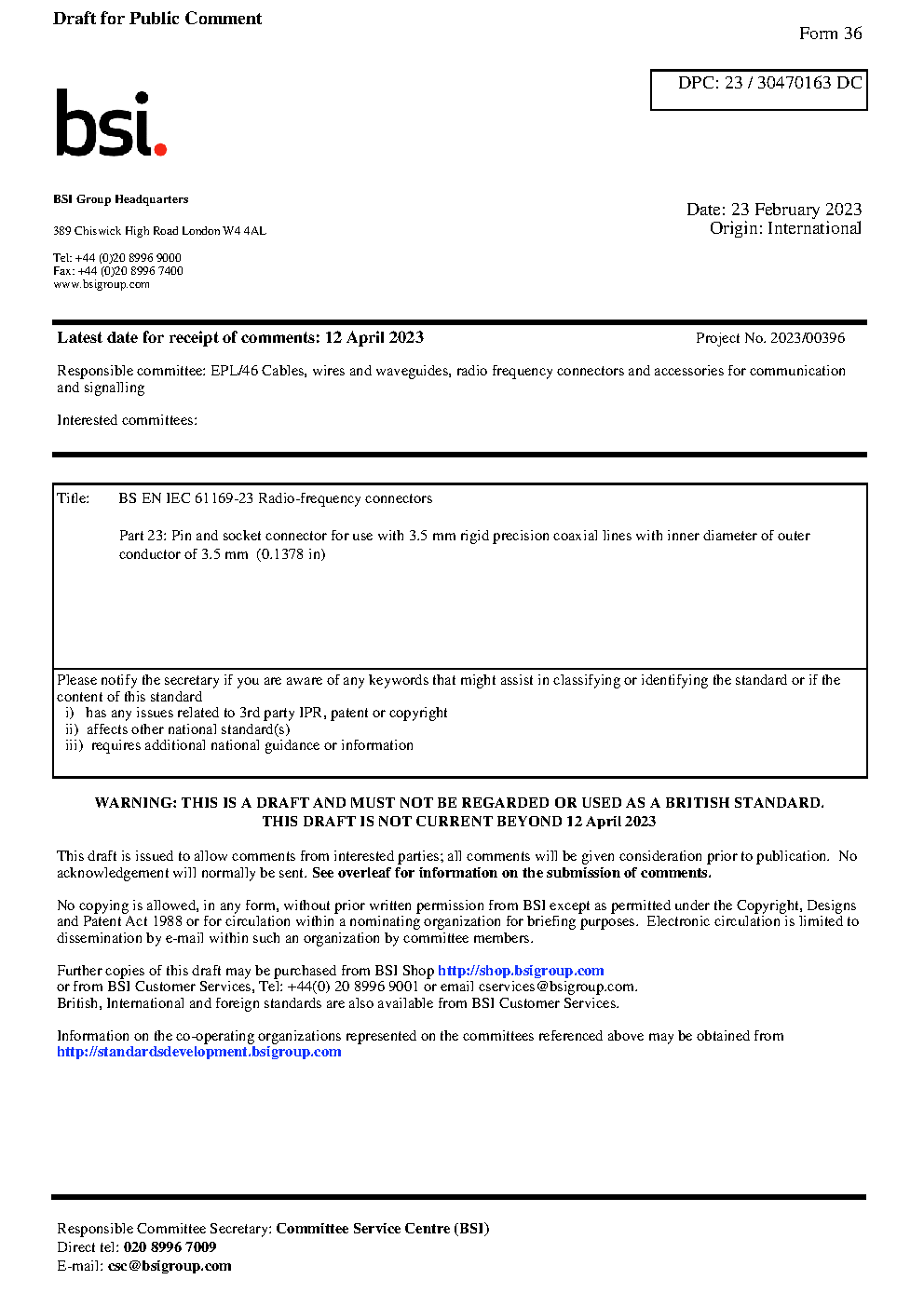 BS EN IEC 61169-23. Radio-frequency connectors Part 23. Pin and socket connector for use with 3.5 mm rigid precision coaxial lines inner diameter of outer conductor (0.1378 in)