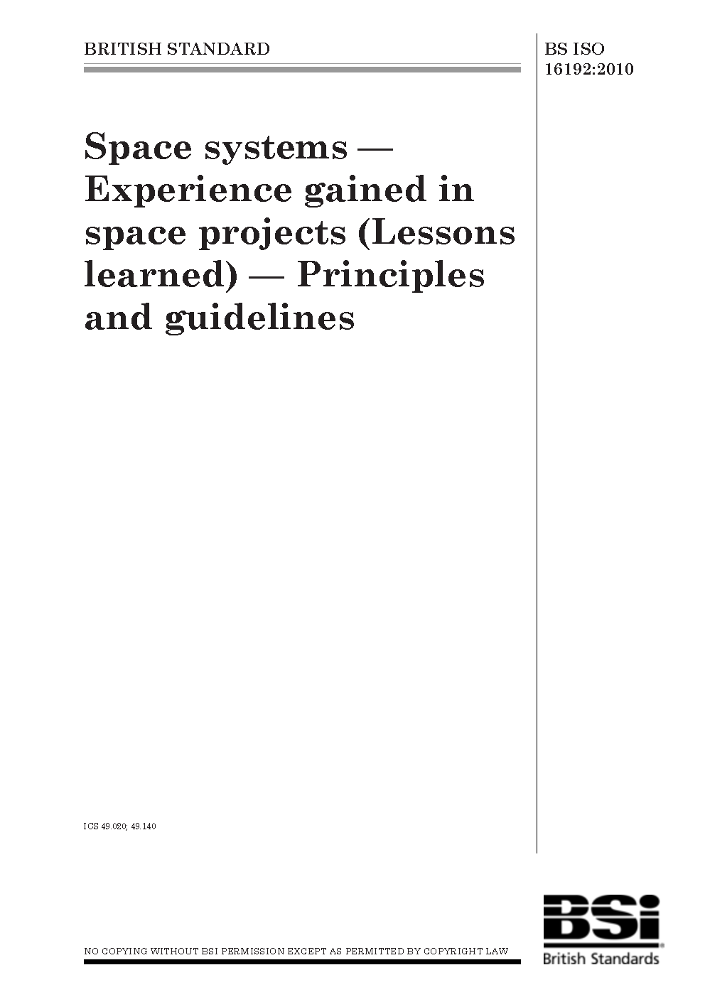 BS ISO 16192. Space systems. Experience gained in space projects (lessons learned). Principles and guidelines