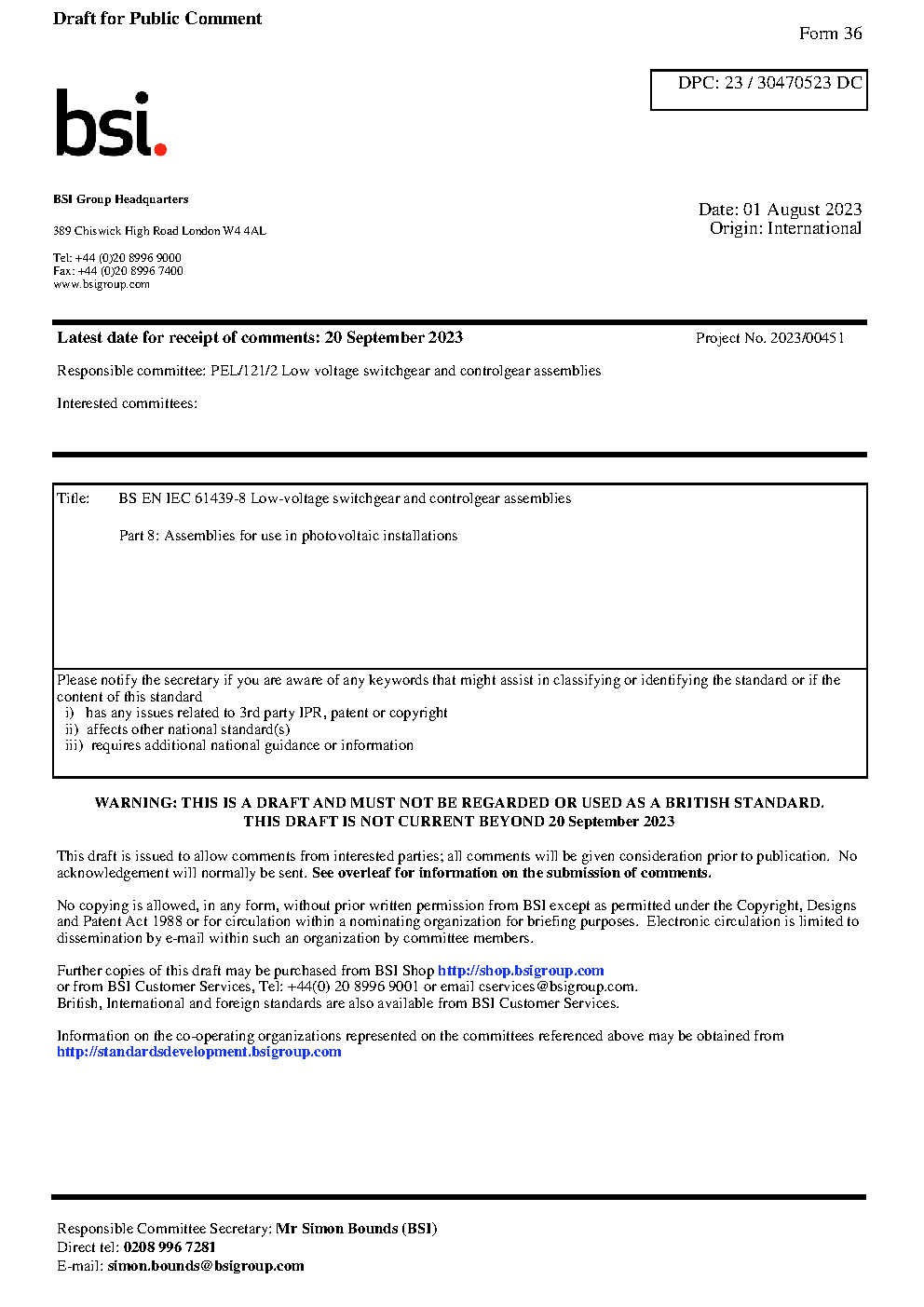 BS EN IEC 61439-8. Low-voltage switchgear and controlgear assemblies Part 8. Assemblies for use in photovoltaic installations