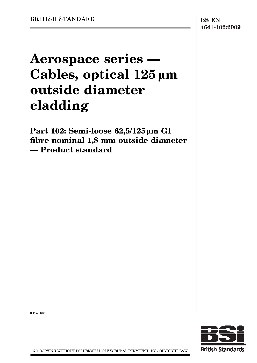 BS EN 4641-102. Aerospace series. Cables, optical 125 µm outside diameter cladding Part 102. Semi-loose 62,5/125 GI fibre nominal 1,8 mm diameter. Product standard