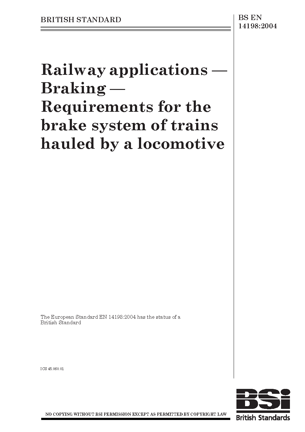 BS EN 14198. Railway applications. Braking. Requirements for the brake system of trains hauled by locomotives