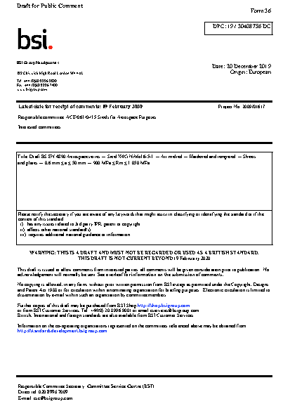 BS EN 4890 AMD 1. Aerospace series. Steel X4CrNiMo16-5-1. Air melted. Hardened and tempered. Sheets and plates. 0,3 mm = a = 50 mm. 900 MPa = Rm = 1 050 MPa