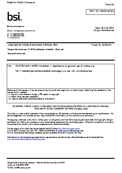 BS EN IEC 60317-2 AMD1 1. Specifications for particular types of winding wires Part 2. Solderable polyurethane enamelled round copper wire, class 130, with a bonding layer
