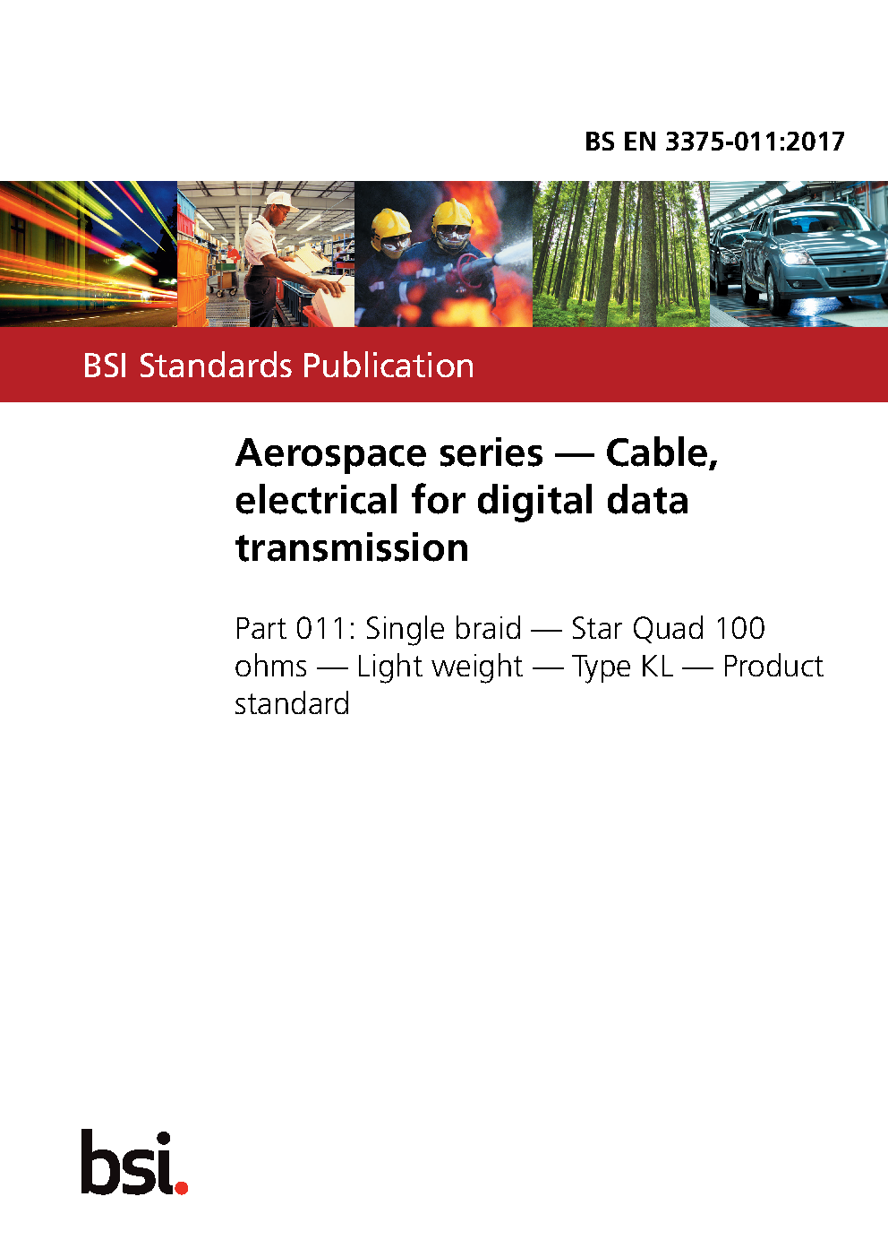 BS EN 3375-011. Aerospace series. Cable, electrical for digital data transmission Part 011. Single braid. Star Quad 100 ohms. Lightweight. Type KL. Product standard