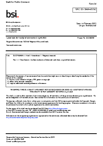 BS EN IEC 60404-1-1 AMD 1. Magnetic materials Part 1-1. Classification. Surface insulations of electrical steel sheet, strip and laminations