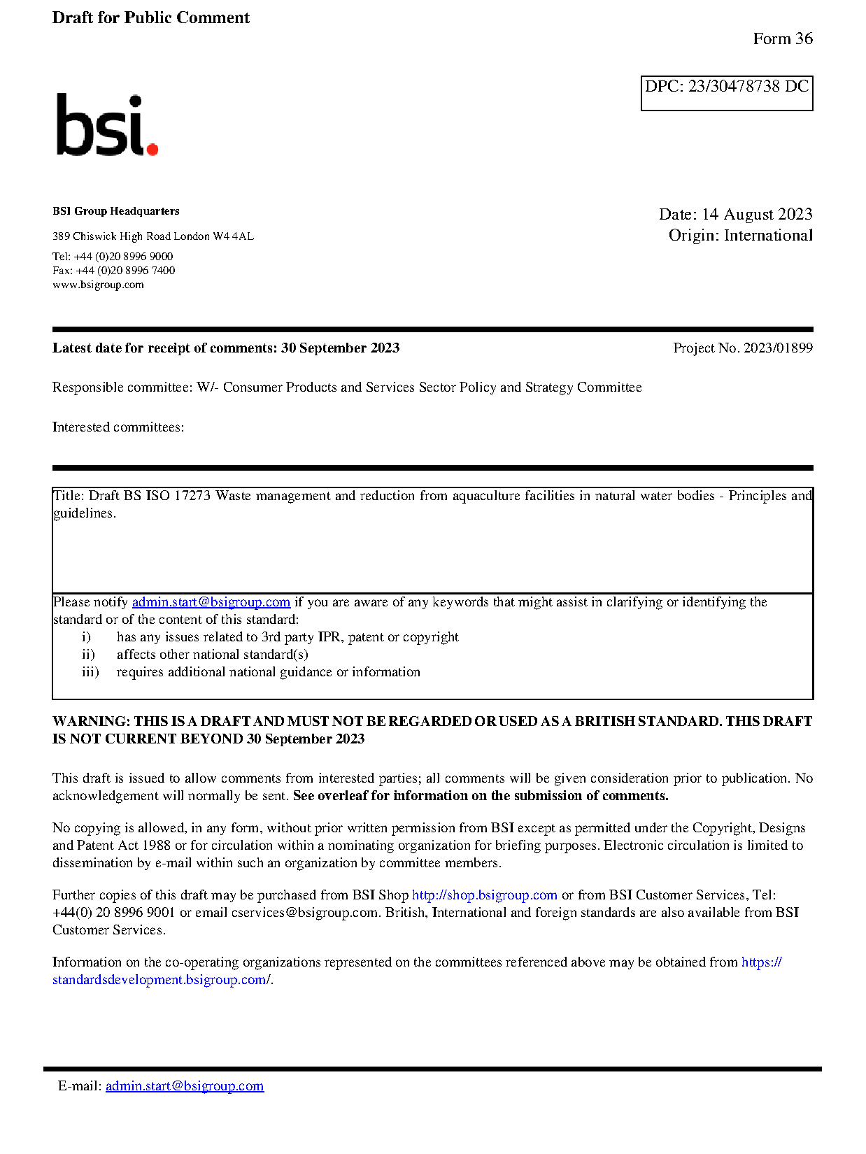 BS ISO 17273. Waste management and reduction from aquaculture facilities in natural water bodies. Principles and guidelines