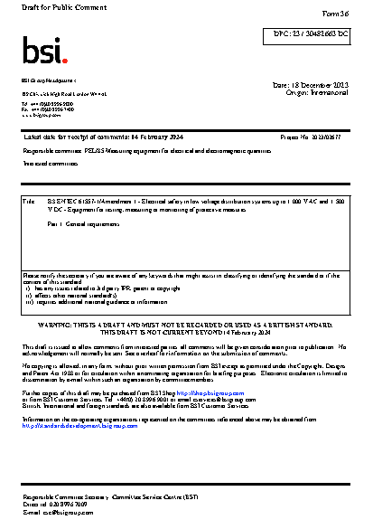 BS EN IEC 61557-1/AMD1 Amendment 1 - Electrical safety in low voltage distribution systems up to 000 V AC and 500 DC Equipment for testing, measuring or monitoring of protective measures Part 1: General requirements