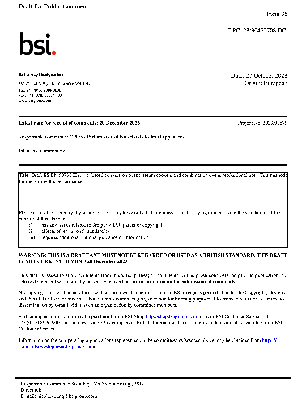 BS EN 50733. Electric forced convection ovens, steam cookers and combination ovens professional use. Test methods for measuring the performance