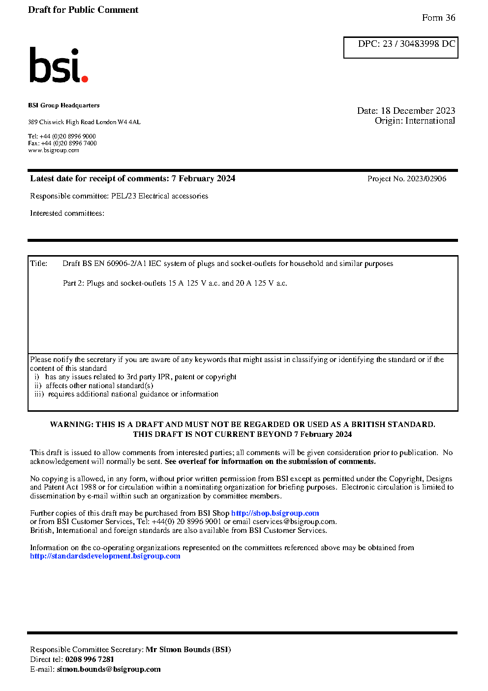 Draft BS EN 60906-2/A1 IEC system of plugs and socket-outlets for household similar purposes Part 2: Plugs 15 A 125 V a.c. 20