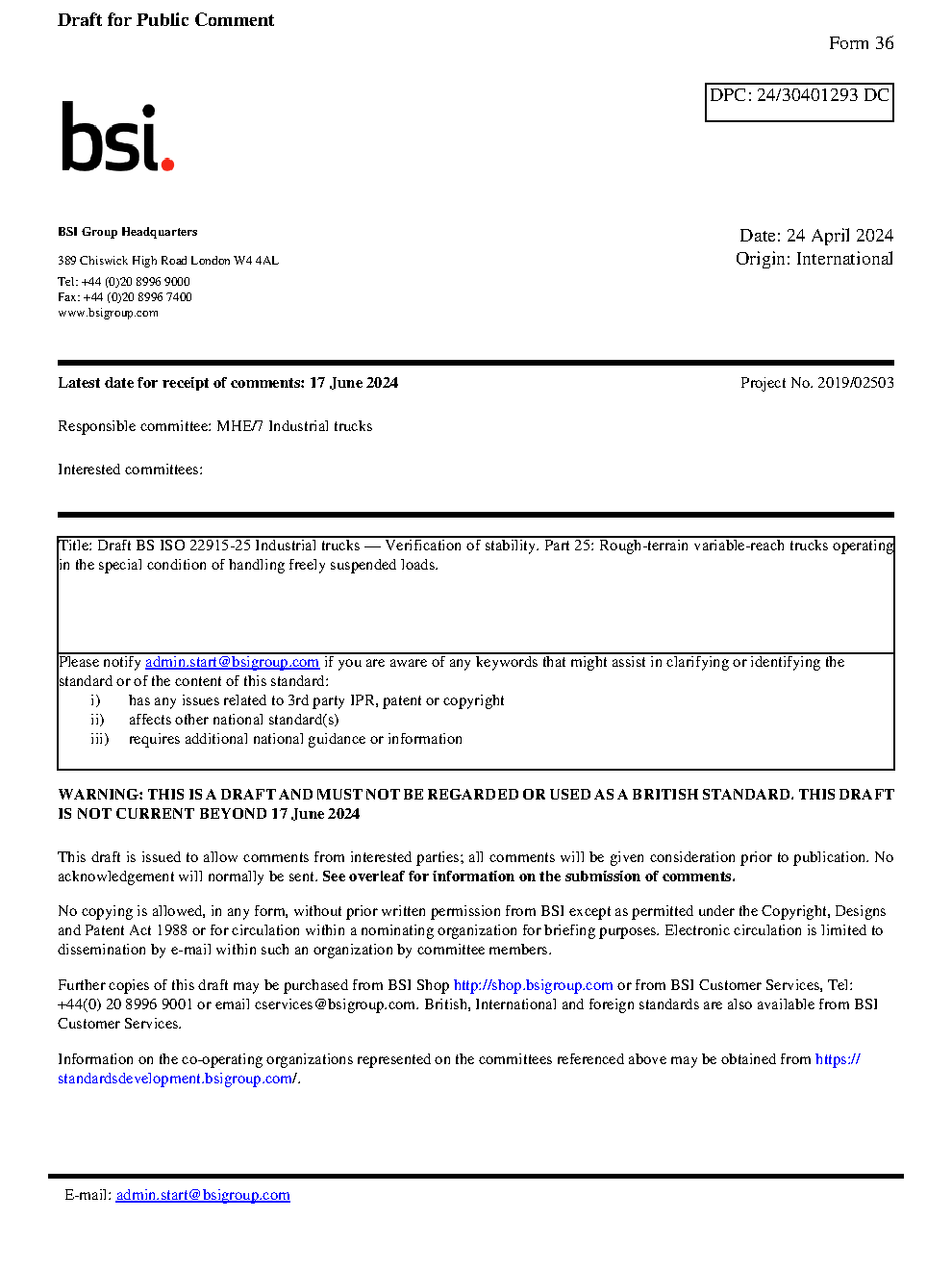BS ISO 22915-25. Industrial trucks. Verification of stability Part 25. Rough-terrain variable-reach trucks operating in the special condition handling freely suspended loads