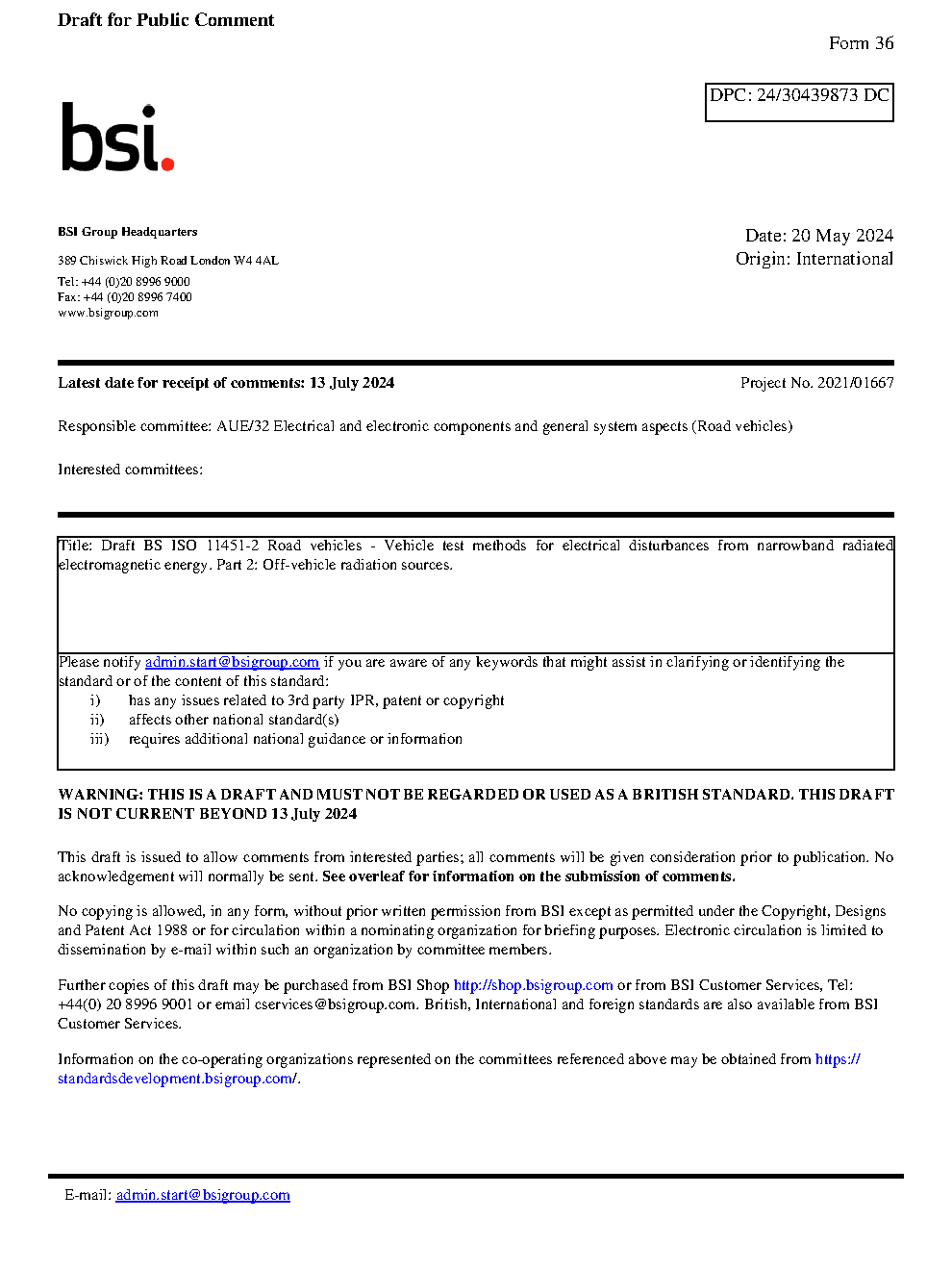 BS ISO 11451-2 Road vehicles. Vehicle test methods for electrical disturbances from narrowband radiated electromagnetic energy Off-vehicle radiation sources
