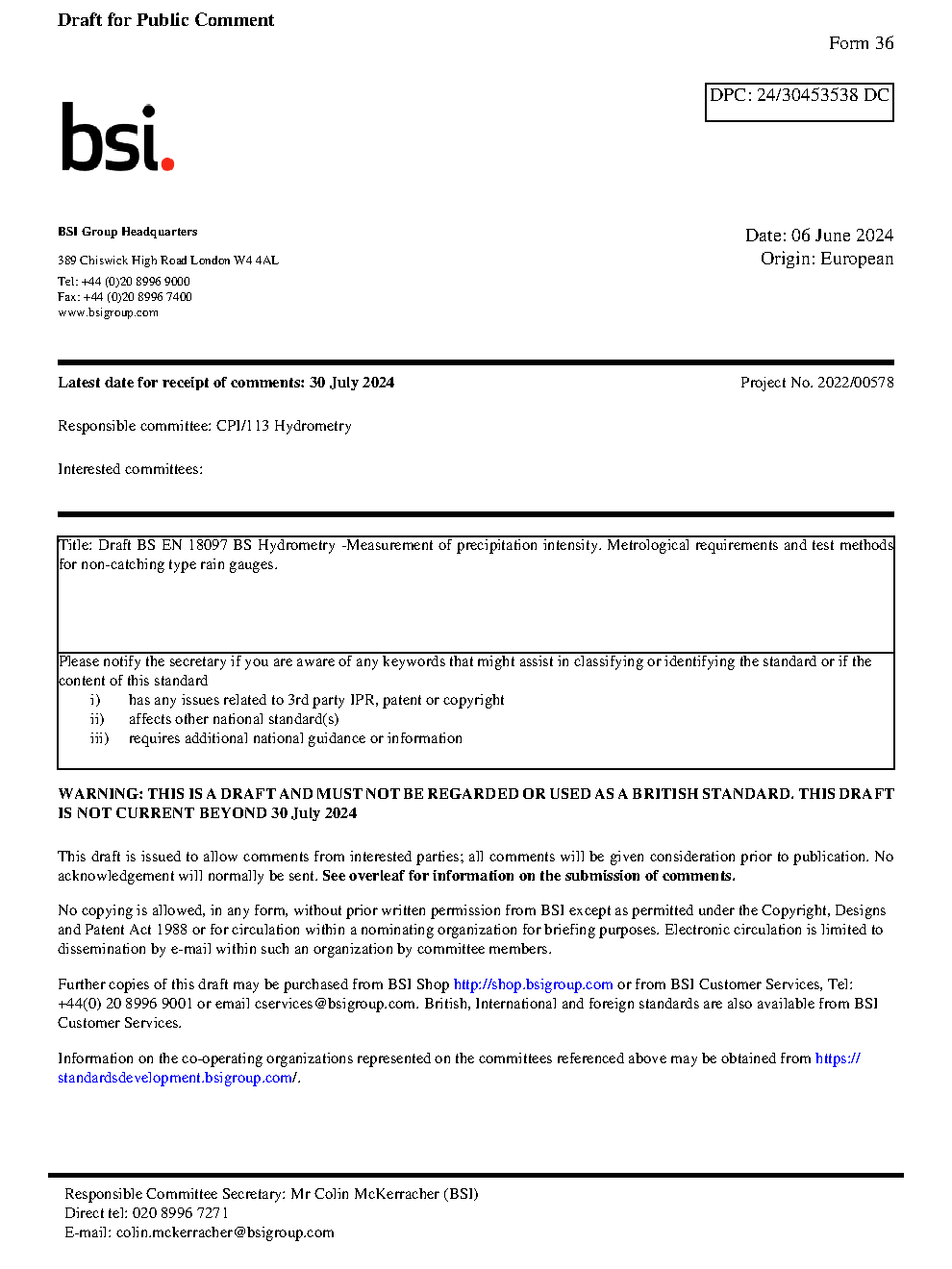 BS EN 18097. Hydrometry. Measurement of precipitation intensity. Metrological requirements and test methods for non-catching type rain gauges