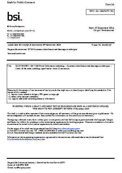 BS EN ISO/IEC 15417:2007/Amd 1Information technology — Automatic identification and data capture techniques — Code 128 bar code symbology specification. AMENDMENT 1: Annex D corrections