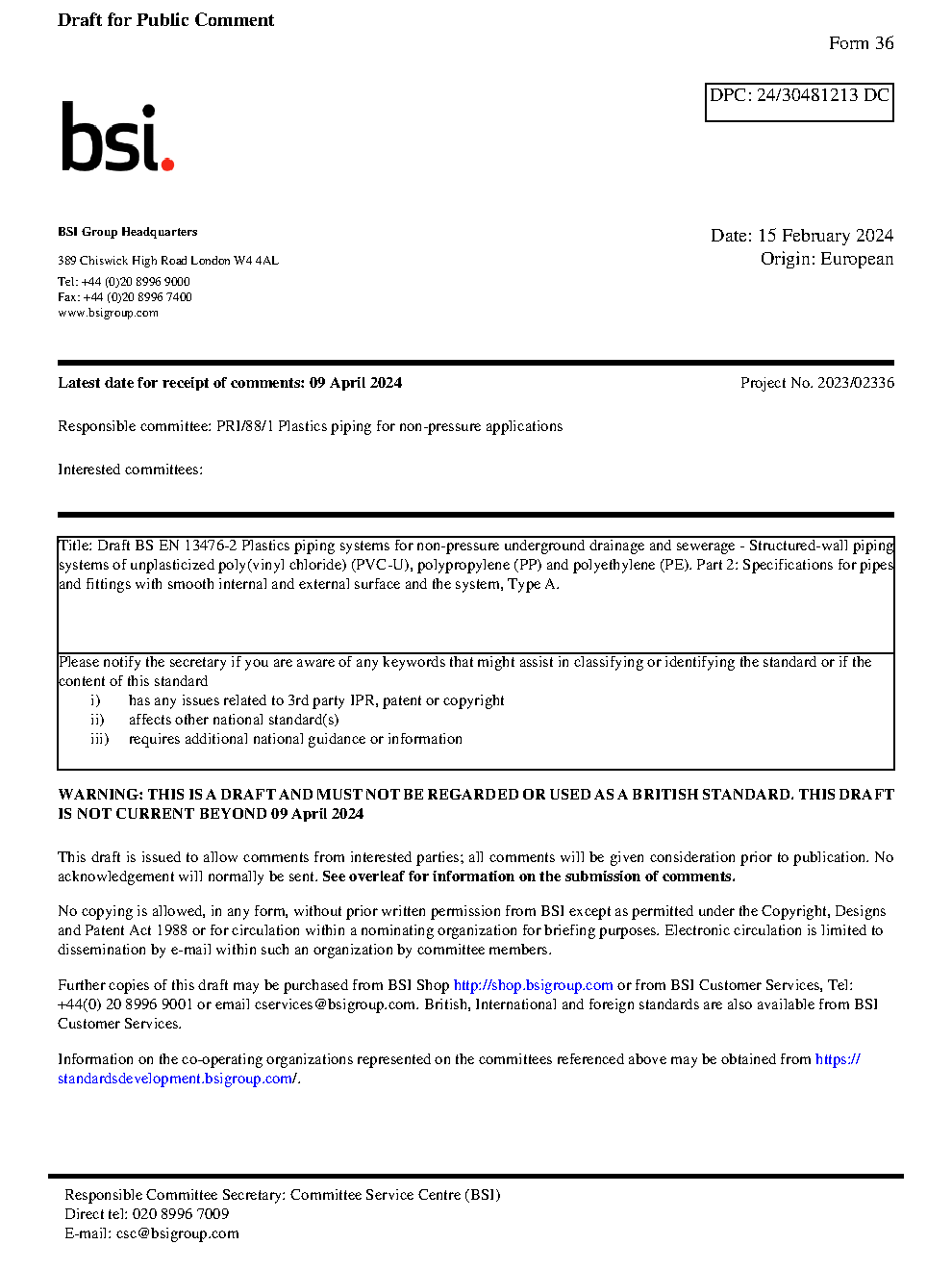 BS EN 13476-2 Plastics piping systems for non-pressure underground drainage and sewerage - Structured-wall of unplasticized poly(vinyl chloride) (PVC-U), polypropylene (PP) polyethylene (PE) Part 2: Specifications pipes fittings with smooth internal external surface the system, Type A