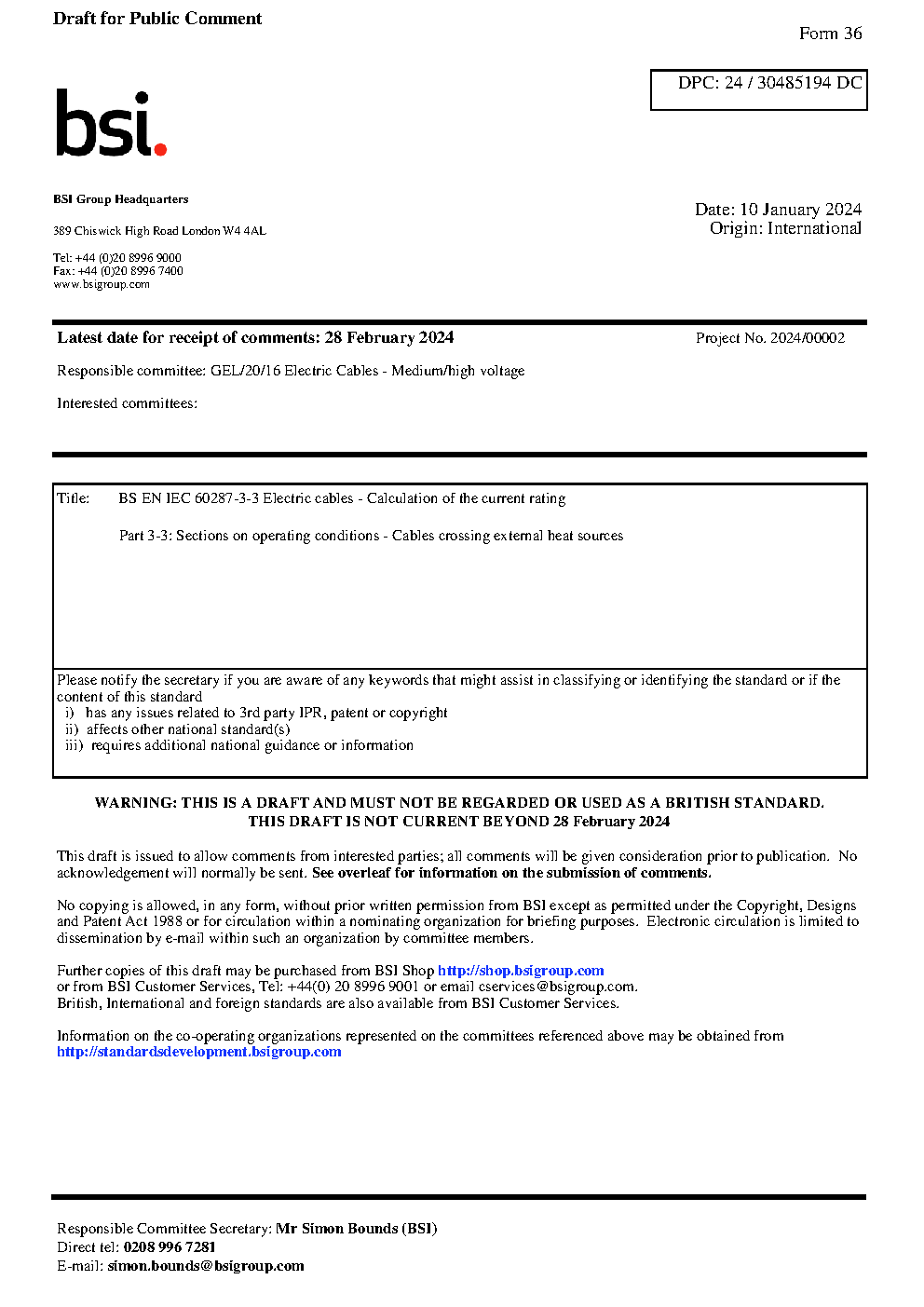 BS EN IEC 60287-3-3 Electric cables. Calculation of the current rating Part 3-3. Sections on operating conditions. Cables crossing external heat sources