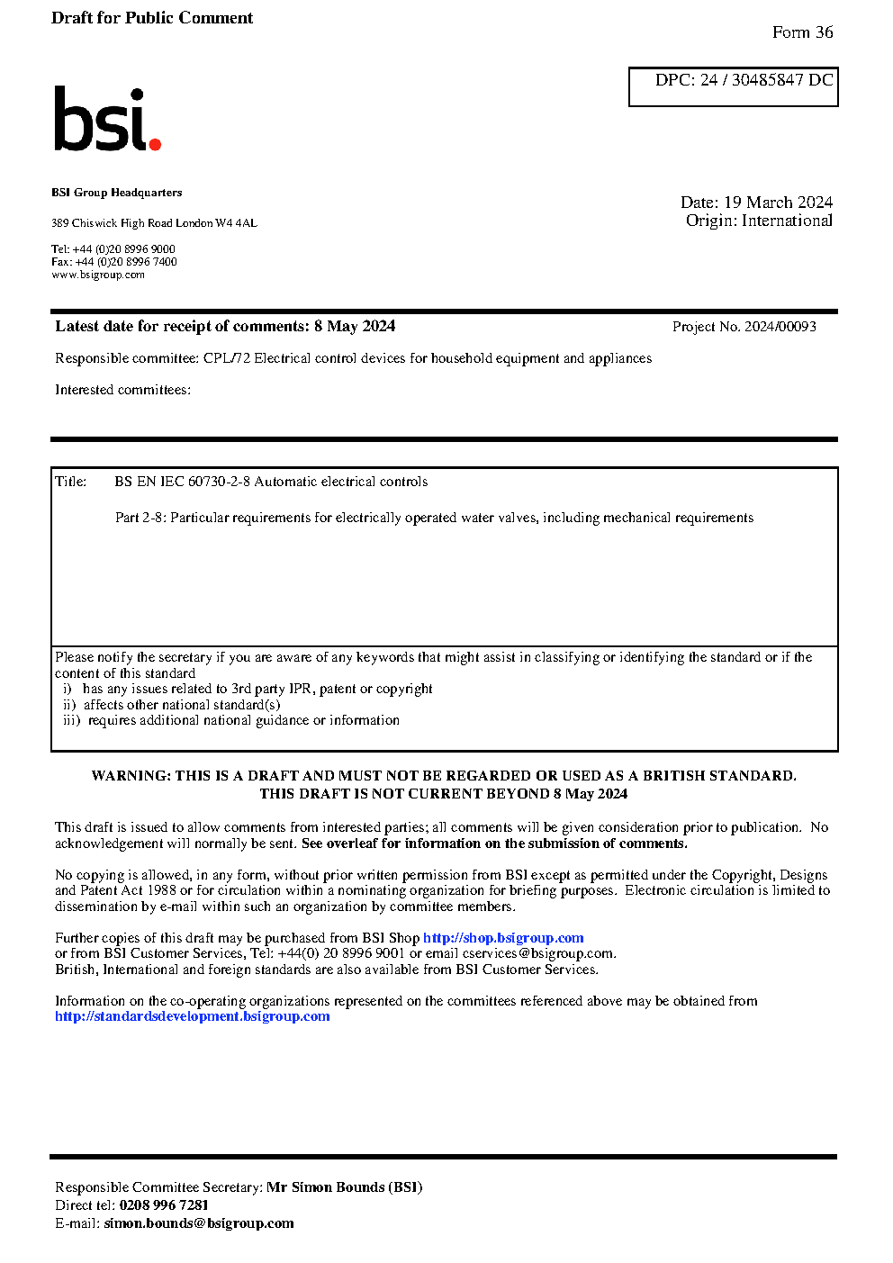 BS EN IEC 60730-2-8 Automatic electrical controls Part 2-8: Particular requirements for electrically operated water valves, including mechanical