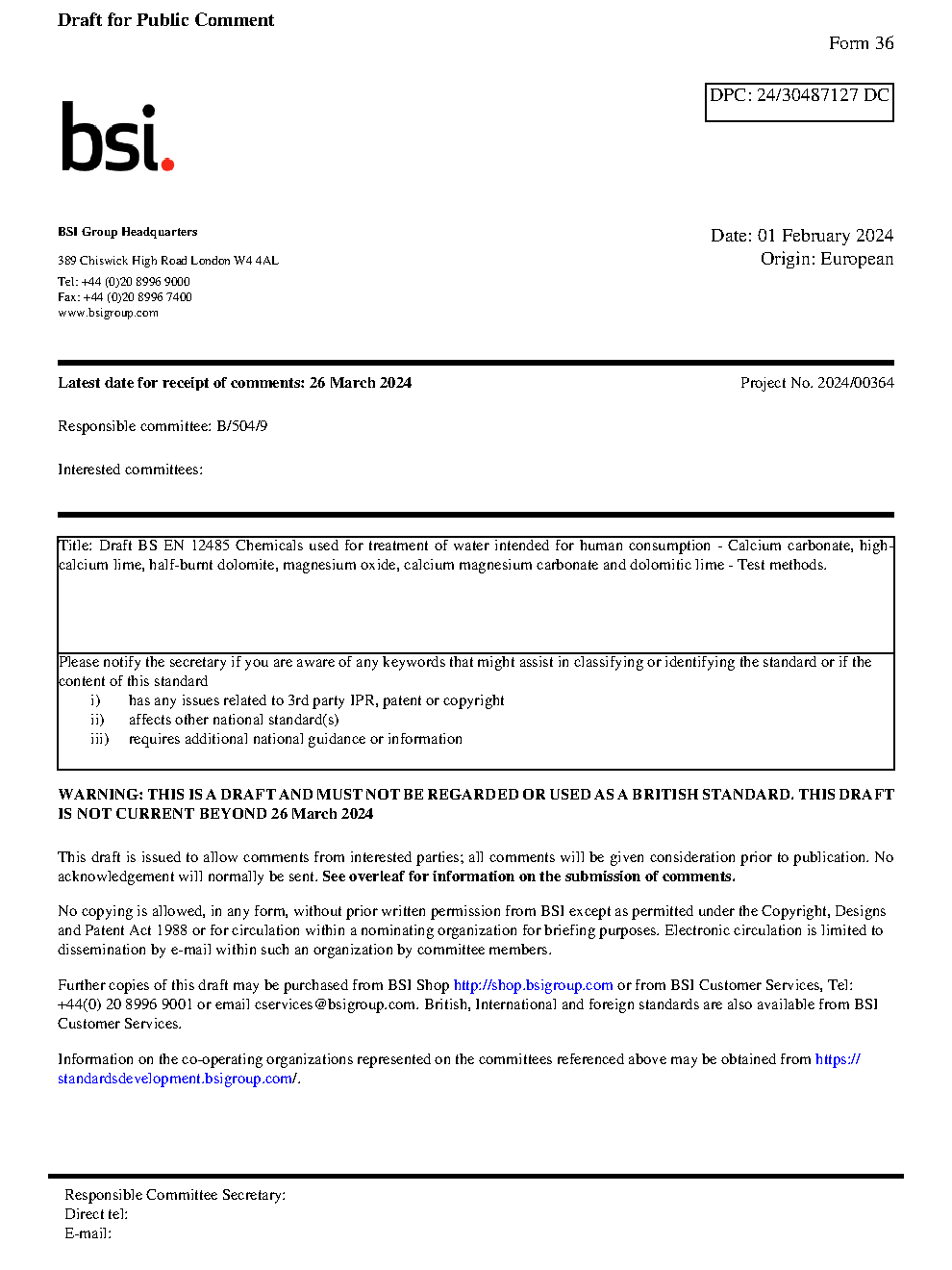 BS EN 12485 Chemicals used for treatment of water intended for human consumption - Calcium carbonate, high-calcium lime, half-burnt dolomite, magnesium oxide, calcium magnesium carbonate and dolomitic lime - Test methods