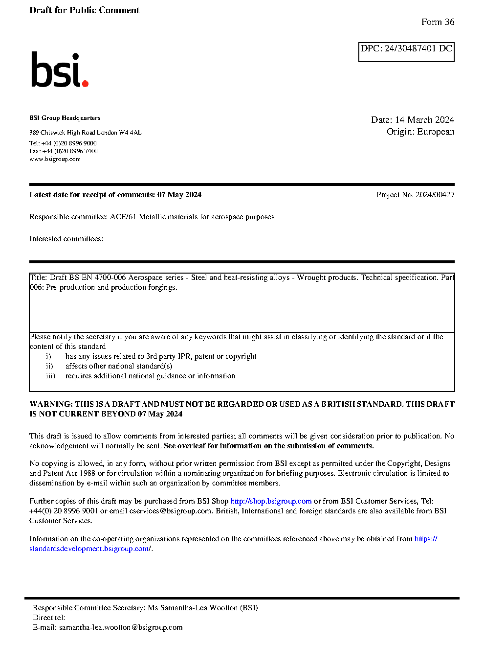 BS EN 4700-006 Aerospace series - Steel and heat-resisting alloys Wrought products. Technical specification Part 006: Pre-production production forgings