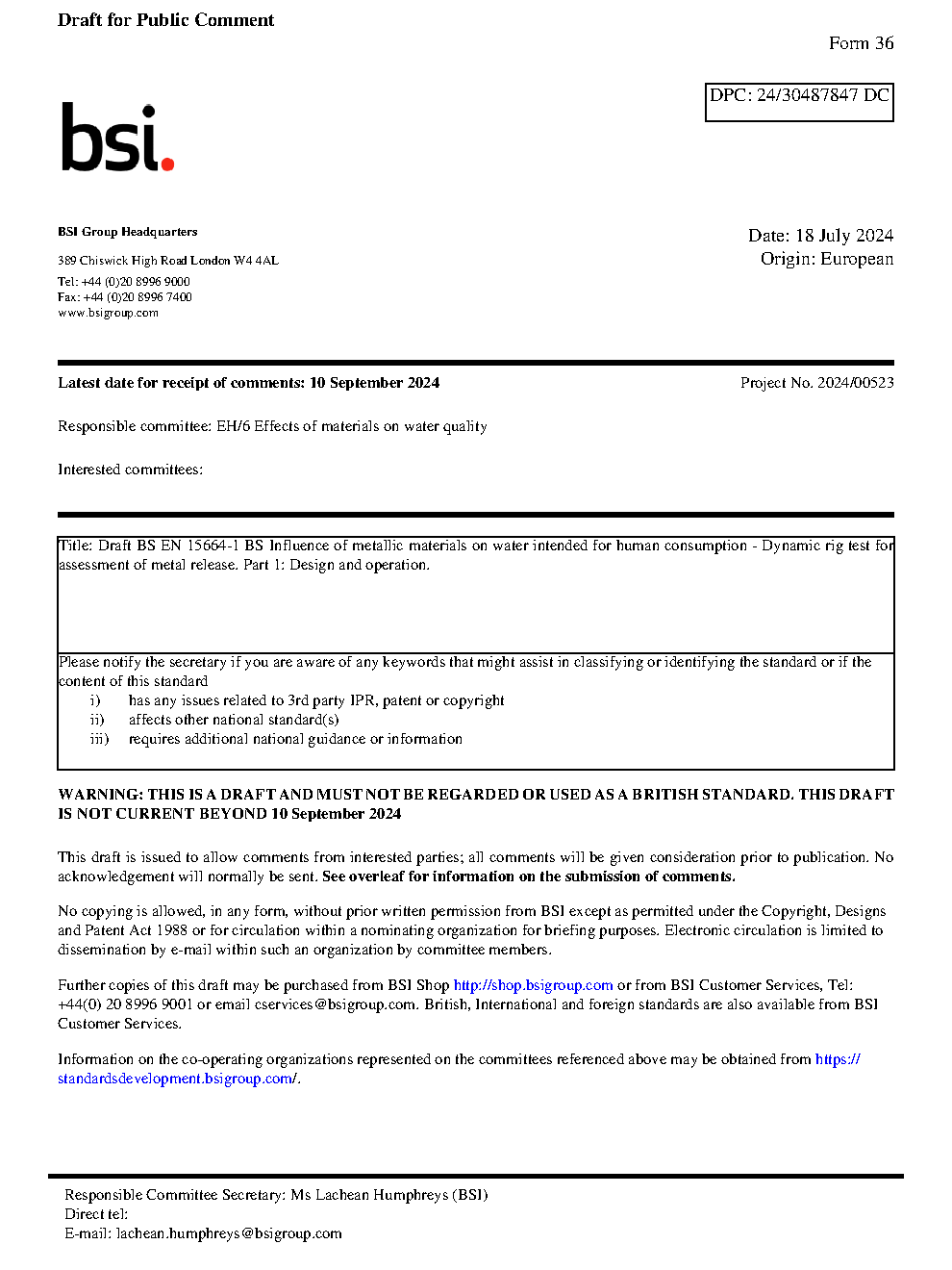 BS EN 15664-1 Influence of metallic materials on water intended for human consumption - Dynamic rig test assessment metal release Part 1: Design and operation