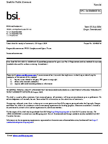 BS ISO 18527-3:2020/Amd 1 Eye and face protection for sports use Part 3. Requirements test methods eyewear intended to be used surface swimming. Amendment