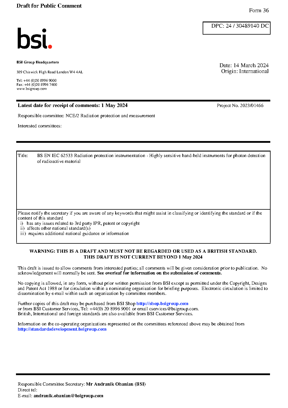 BS EN IEC 62533 Radiation protection instrumentation – Highly sensitive hand-held instruments for photon detection of radioactive material
