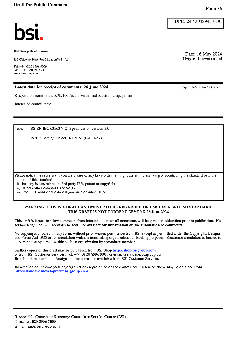 BS EN IEC 63563-7 Qi Specification version 2.0 Part 7. Foreign Object Detection (Fast track)