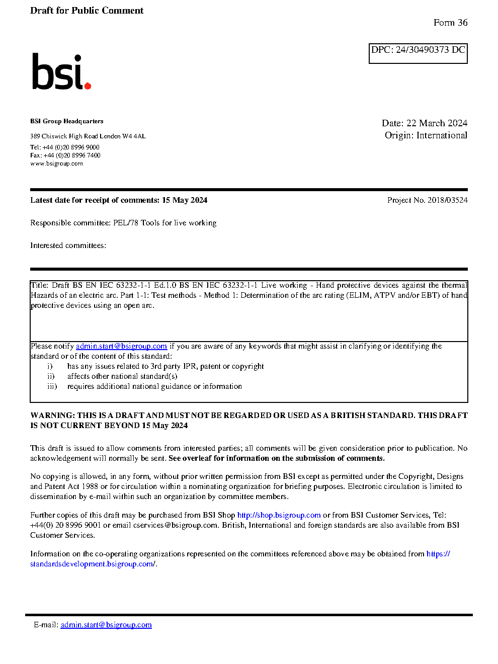 BS EN IEC 63232-1-1 Live working - Hand protective devices against the thermal Hazards of an electric arc Part 1-1: Test methods Method 1: Determination rating (ELIM, ATPV and/or EBT) hand using open