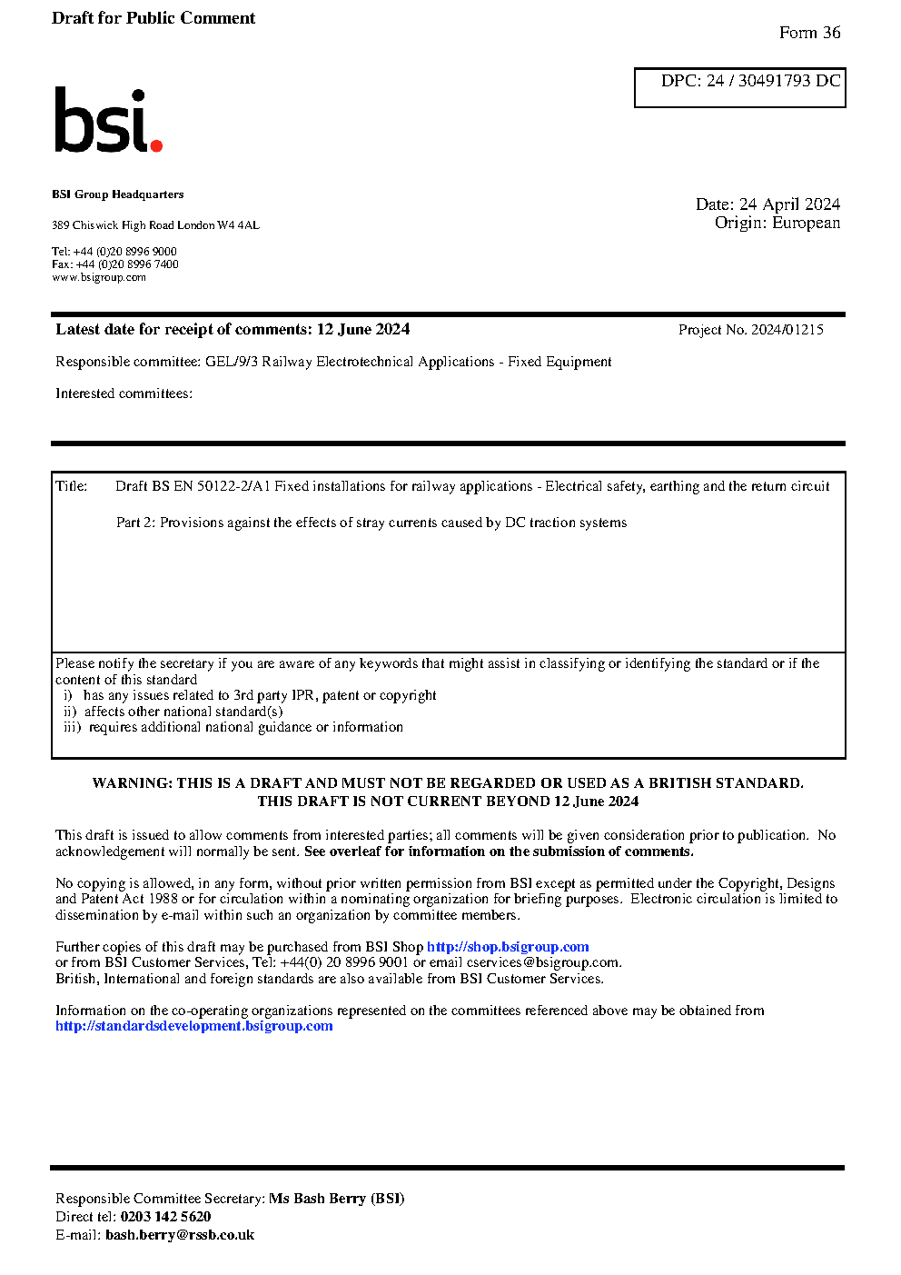Draft BS EN 50122-2/A1 Fixed installations for railway applications. Electrical safety, earthing and the return circuit Provisions against effects of stray currents caused by DC traction systems