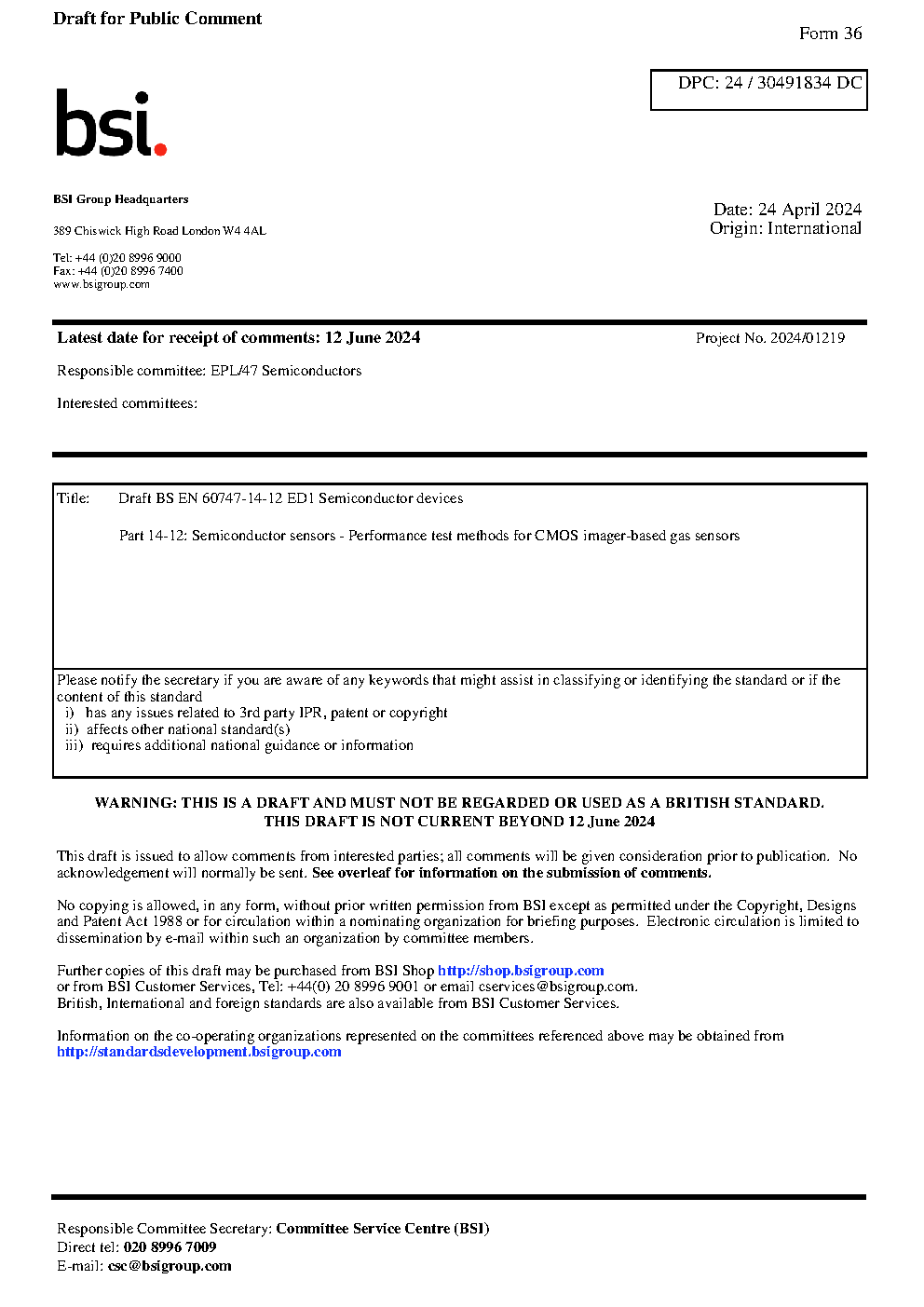Draft BS EN 60747-14-12 ED1 Semiconductor devices Part 14-12: sensors - Performance test methods for CMOS imager-based gas
