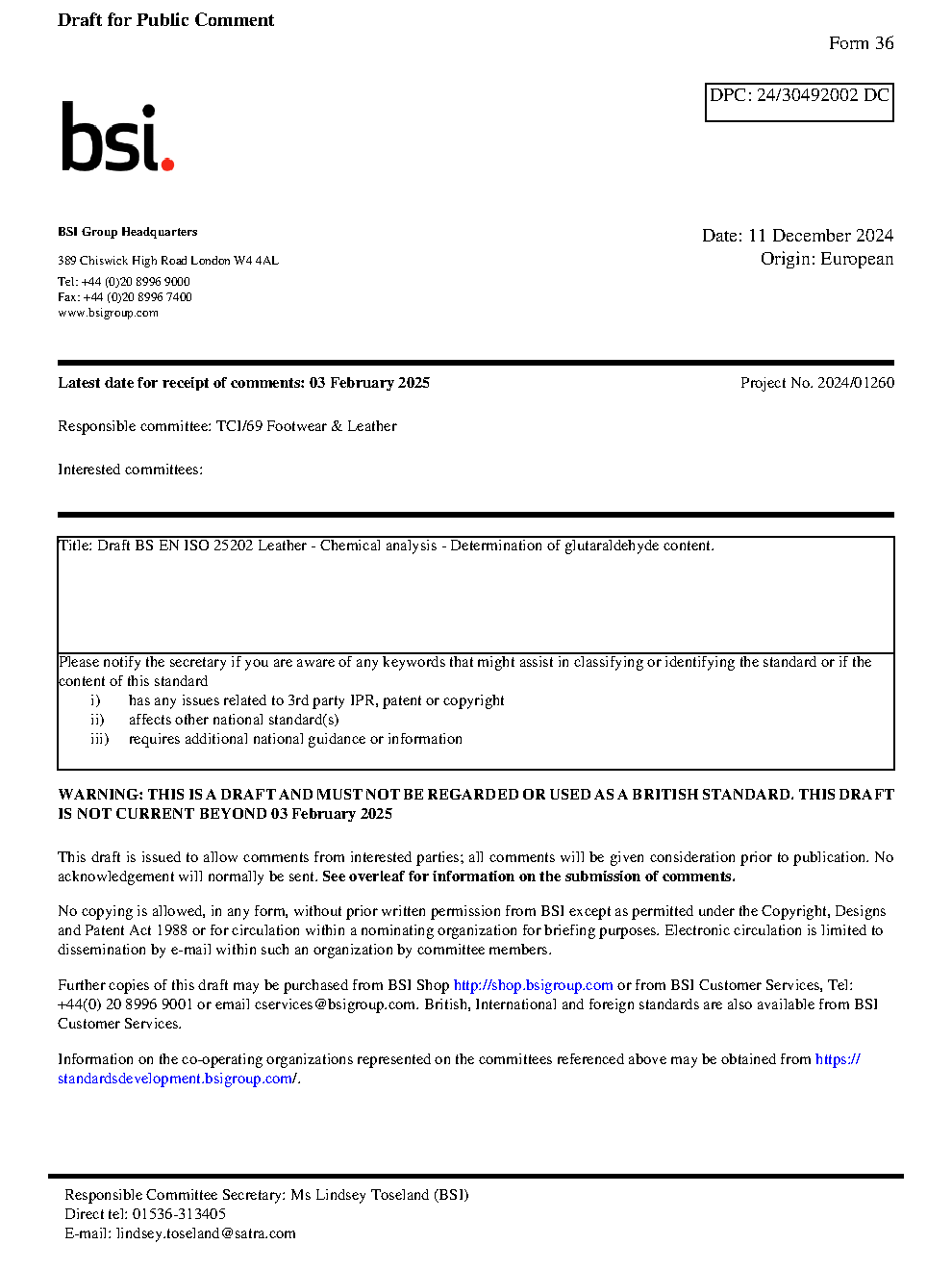 BS EN ISO 25202. Leather. Chemical analysis. Determination of glutaraldehyde content