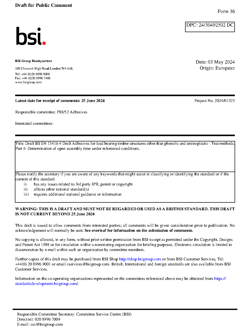 Draft BS EN 15416-4 Adhesives for load bearing timber structures other than phenolic and aminoplastic - Test methods Part 4: Determination of open assembly time under referenced conditions