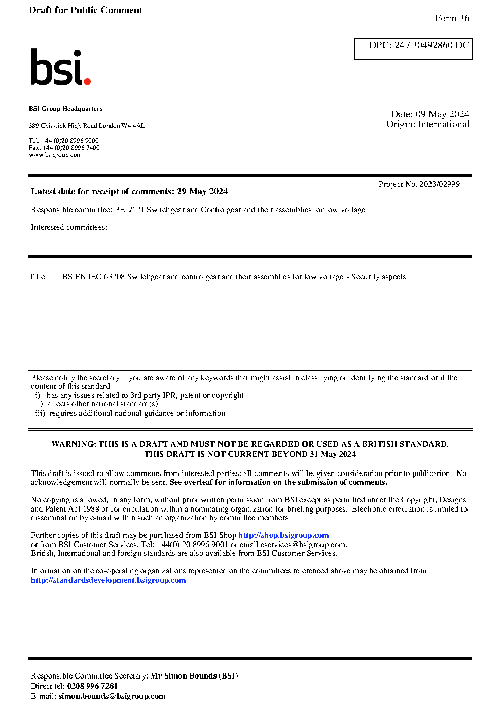 BS EN IEC 63208 Switchgear and controlgear and their assemblies for low voltage – Security aspects