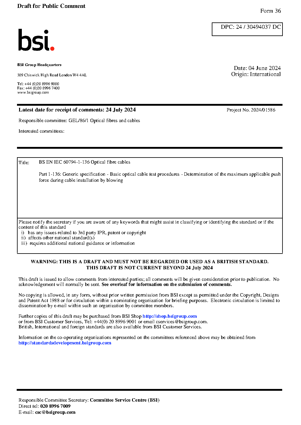 BS EN IEC 60794-1-136 Optical fibre cables Part 1-136: Generic specification – Basic optical cable test procedures Determination of the maximum applicable push force during installation by blowing