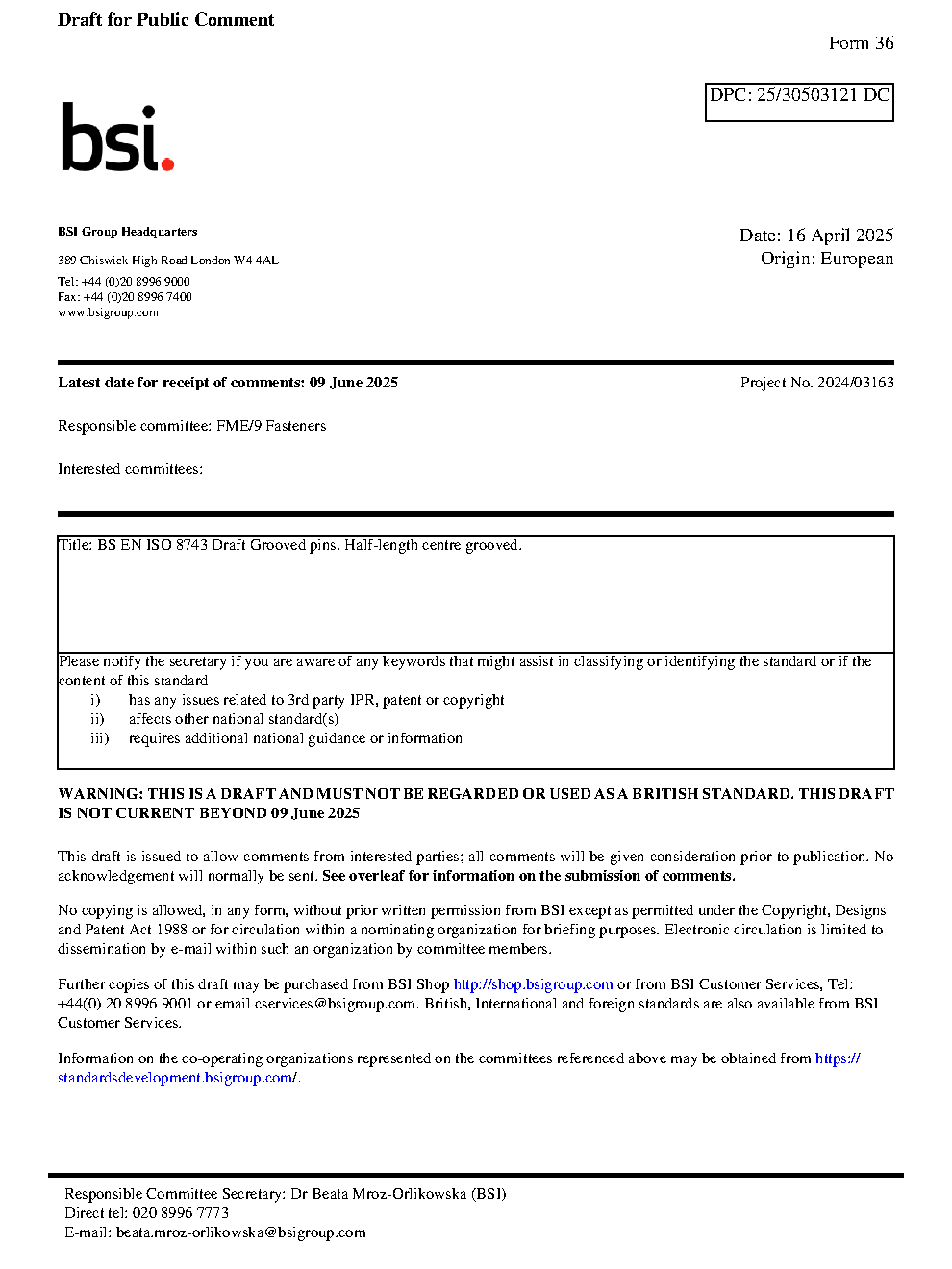 Draft BS EN ISO 8743 Grooved pins. Half-length centre grooved